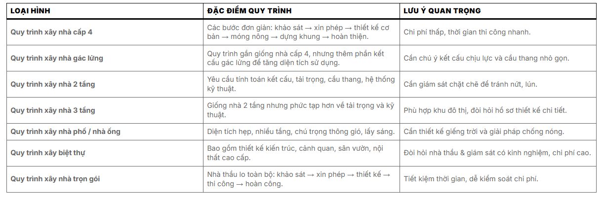 Bảng quy trình xây nhà theo loại hình