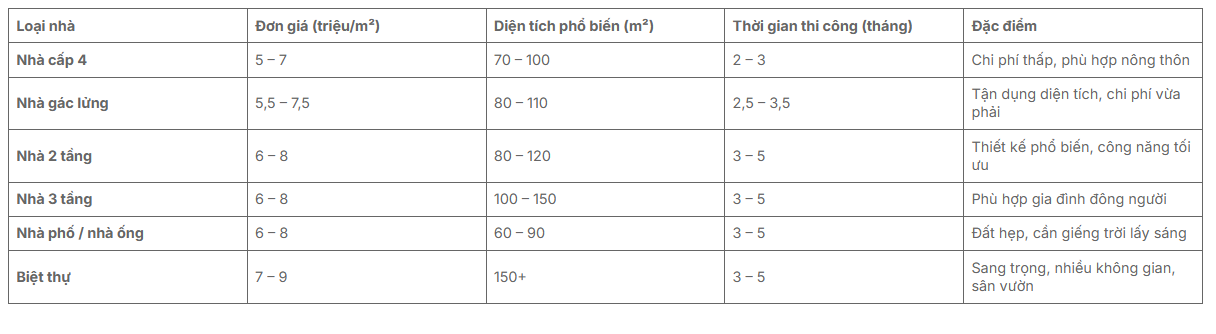 Chi phí xây dựng nhà ở phụ thuộc vào loại hình công trình, diện tích, vật liệu và gói dịch vụ thi công. Dưới đây là bảng chi phí tham khảo 2025 theo từng loại hình phổ biến, giúp bạn ước tính sơ bộ trước khi triển khai: