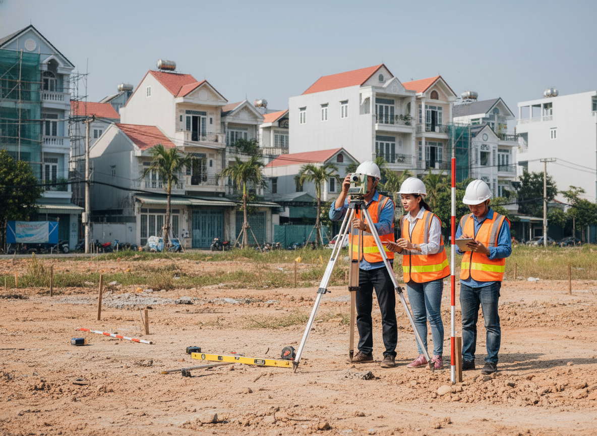 - Đo đạc hiện trạng khu đất để xác định diện tích, ranh giới và cao độ nền.