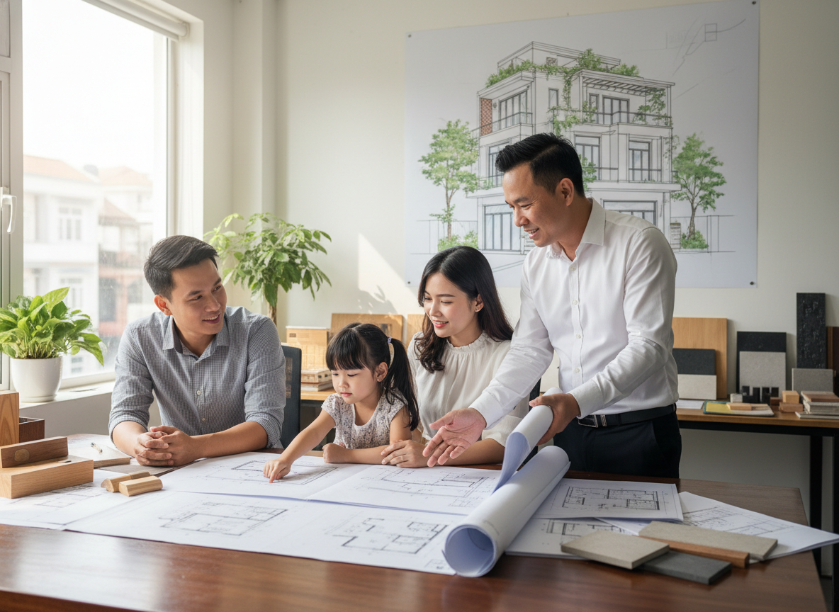 - Kiến trúc sư lắng nghe mong muốn về số tầng, diện tích, phong cách kiến trúc và ngân sách dự kiến.